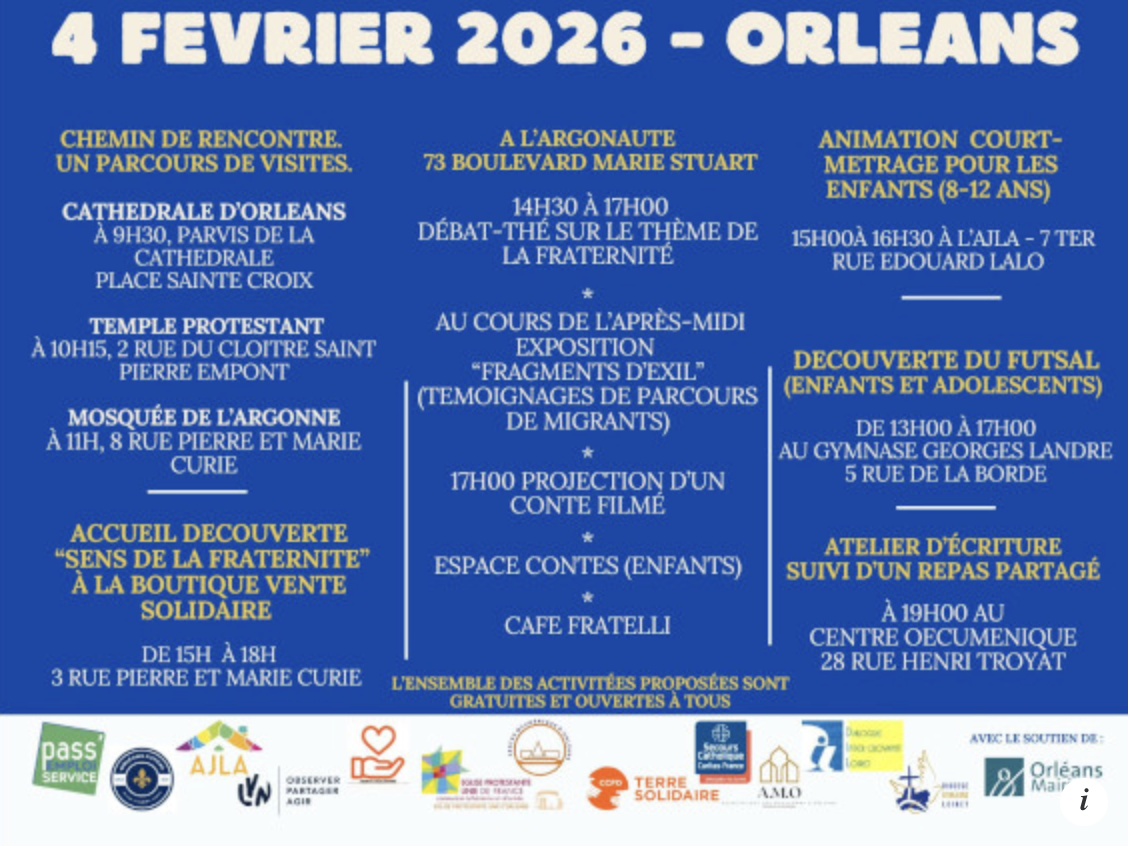 Le 4 février : un temps fort à ne pas manquer, célébré chaque année à Orléans. Au centre oecuménique, atelier d'écriture à 19h